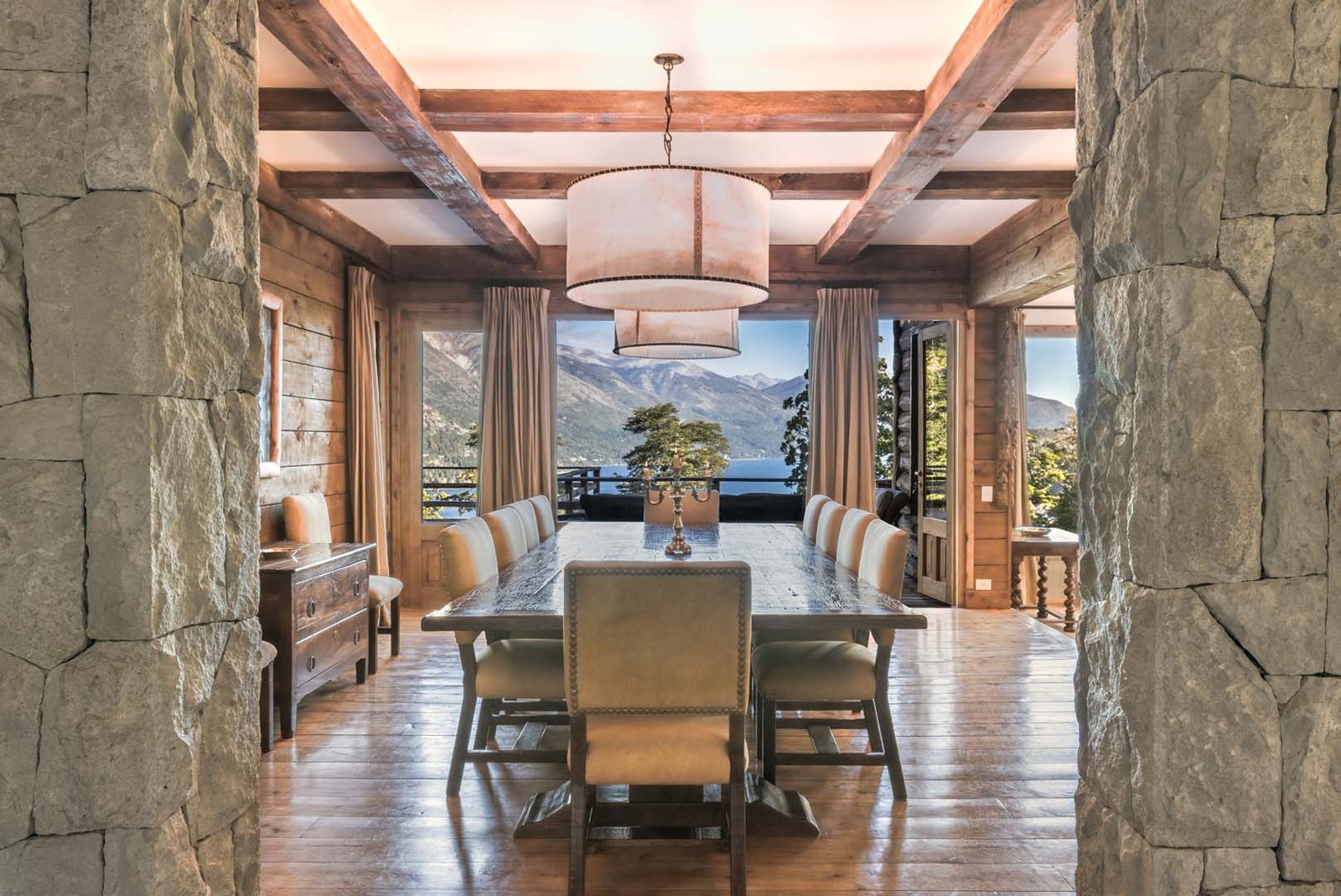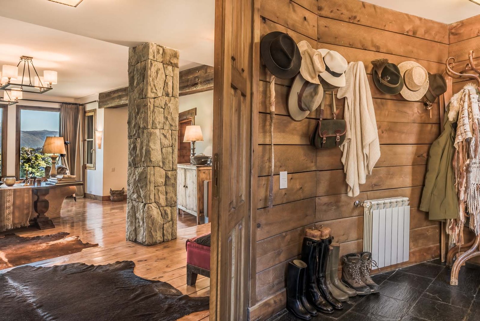 Entering the lower level through a cold entryway, then into a small distribution hall that accesses the large living room with a fireplace oriented to the southwest with a magnificent view to Lago Gutiérrez through the large picture windows, which also has an access to the deck. To the left of the living room we find a cosy dining room suited to entertain 16 guests, and to the right we see a cypress wood-coated library that is accessed through a lenga wood sliding door.