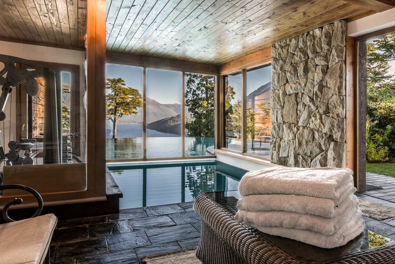 On the underground level we find a spacious area for storing bicycles, skis, and sport gear, with lenga furniture and grey stone floors with cypress baseboards, which connects us to the swimming pool area that has a gym overlooking the swimming pool and the lake, a playroom, and service area. The in/out swimming pool has, in the same area, a fireplace and a dressing room with walls entirely covered with stone.The house is surrounded by tree species like coihues, cypresses, arrayanes and radales. The automatic sprinkler irrigation system is placed throughout all the entire lawn.